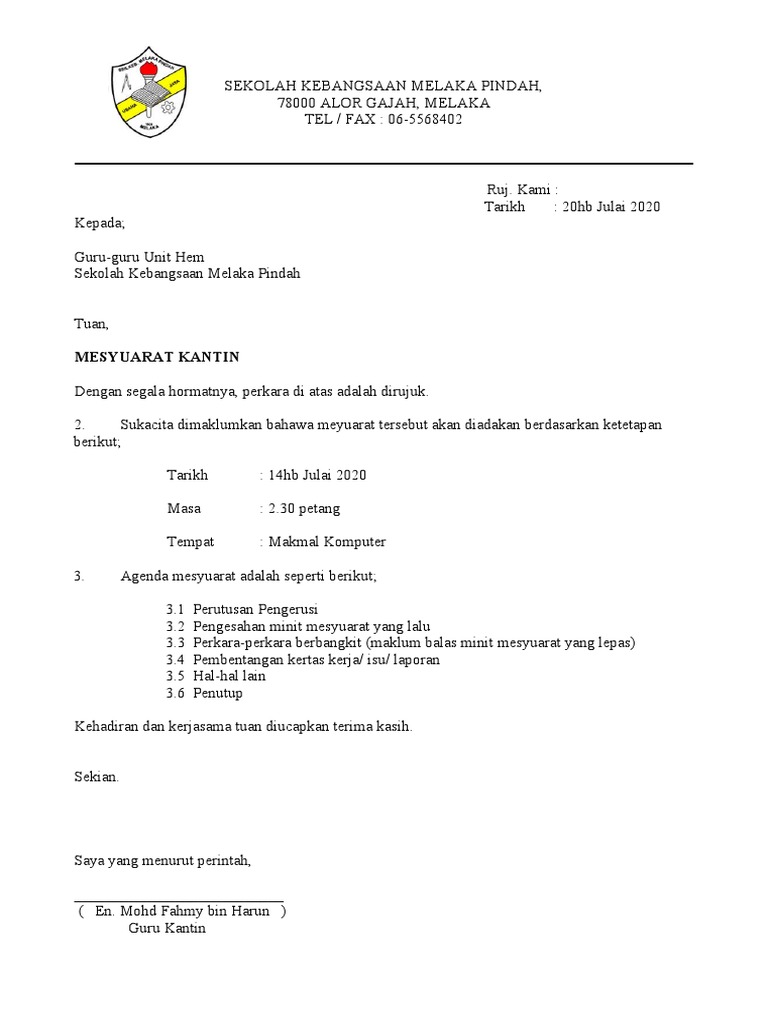 Contoh Surat Panggilan Mesyuarat Kantin Contoh Surat